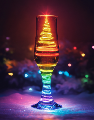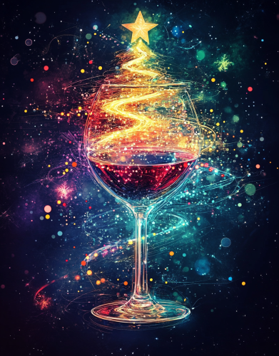 a glass of wine with the stem of the glass in the shape of a Christmas tree, Christmas background with Christmas tree and lights, light colorful, colors background --ar 45:58