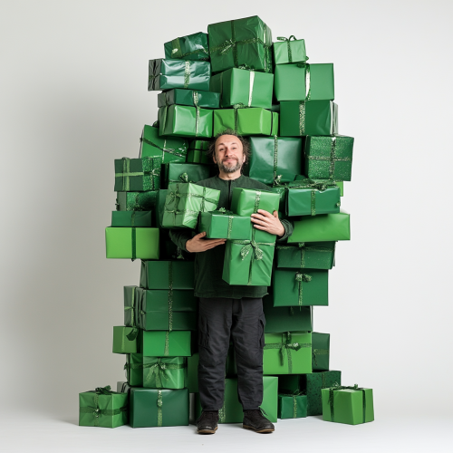 a man in Riga is holding a huge pile of green monochrome gifts, high resolution photo, funny, lowlight , white background, 5 meters tall pile of gifts --v 6.1
