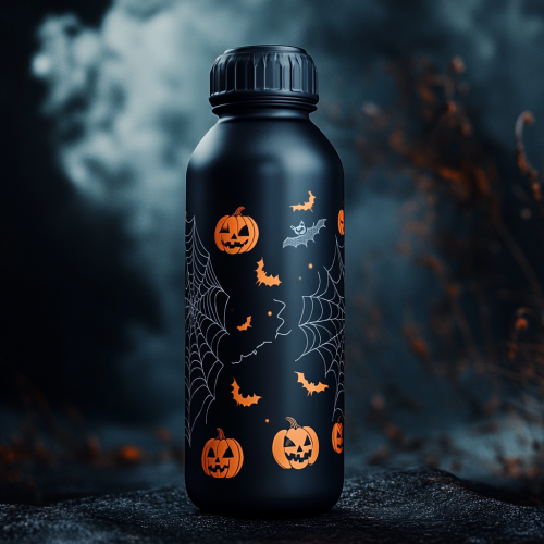 Realistic image of a black water bottle with Halloween-themed accents. The bottle features subtle orange and white Halloween designs, such as small pumpkins, bats, and spooky cobwebs, wrapping around the bottle. The cap has a matte black finish, and the scene is set against a misty, eerie background with soft shadows. High detail, with a dark yet playful Halloween vibe.