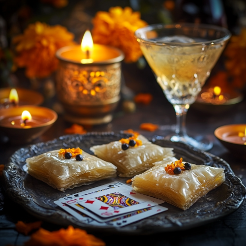 bright and fresh image of dryfruit eclairs on table with playing cards and marigold flower and diyas as props and there ia also a gin and tonic cocktail in a seperate goblet glass on the table in a brightly lit image