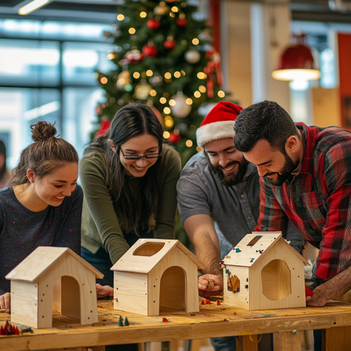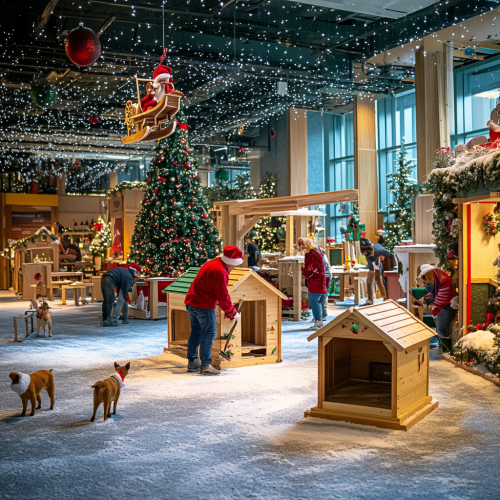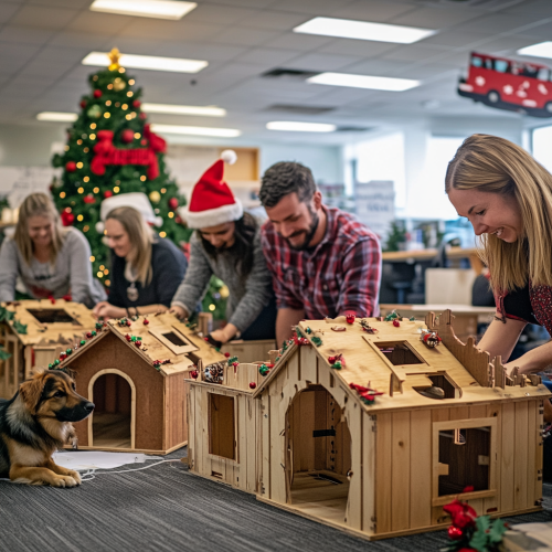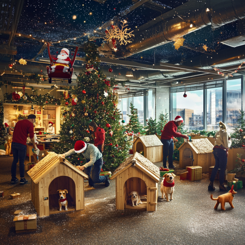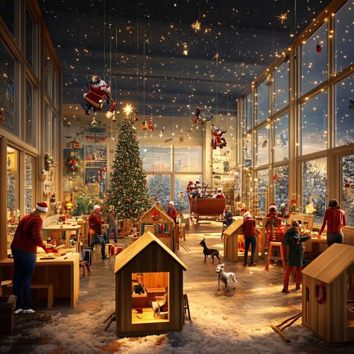 A wide, cinematic view of office employees building small, cozy wooden dog houses with carefully sized entrances--not too large, just right for a shelter dog--in a warmly decorated, Christmas-themed office. The space sparkles with fairy lights, ornaments, and a towering Christmas tree casting a festive glow. In the background, employees hold tools like hammers and paintbrushes, working together in cheerful holiday sweaters and Santa hats. The ceiling seamlessly transforms into a starry night sky, where Santa Claus and his sleigh with reindeer soar across. Snow falls softly outside the windows, filling the scene with a magical, holiday spirit.