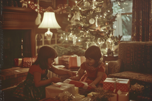 1960s-style Polaroid photo of two kids eagerly unwrapping Christmas gifts, cozy room setting. Christmas tree adorned with vintage lights and ornaments in the background, warm ambient lighting illuminating the scene. Muted colors, soft edges, and slight film grain add a classic, timeless feel. --style raw --ar 3:2 --v 6.0