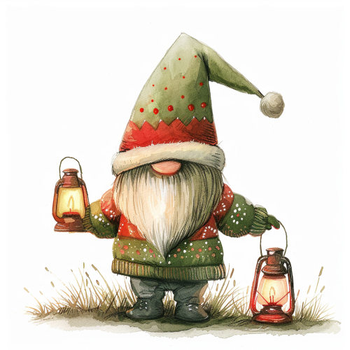 watercolor Christmas gnome wearing green christmas sweater with Christmas red santa hat and holding christmas lantern, clipart, mary blair style, on white background --v 6.0 --s 250