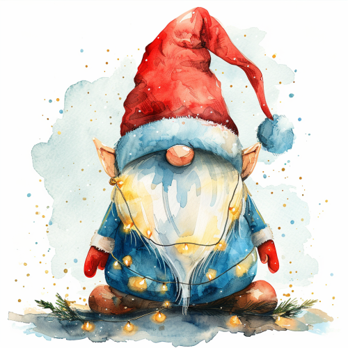watercolor Christmas gnome with Christmas red santa hat and christmas lights wraped around the hat, clipart, mary blair style, on white background --v 6.0 --s 250