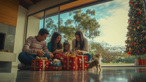 Wonderful Christmas celebration. At a Mexican modern house. With a beautiful big Christmas tree and a lot of Christmas gifts. A happy modern Mexican Family is opening gifts. There is mom, dad, a girl and two guys. There is a happy strong Husky playing and a happy tabby cat playing jumping. Christmas vibes. Full shot photo. Full scene. Ultra wide photo. 16 mm lens. Magazine photo. Ads photo. Cinematic. Stock photo style. Photo direction. Art direction. --ar 16:9