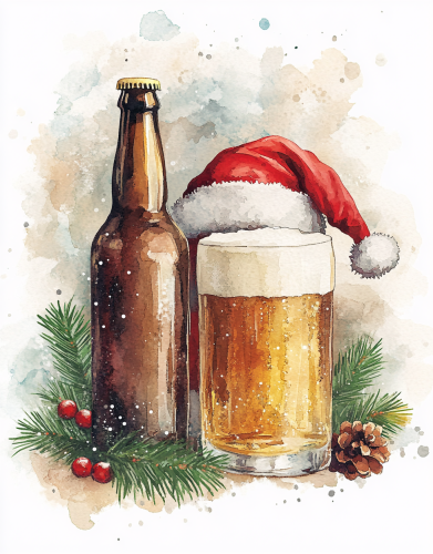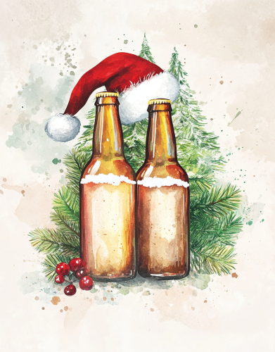 poster with an watercolor illustration of 2 beer bottles clinking, wearing a Santa hat, on a holiday, christmas tree and light watercolor background. --ar 45:58