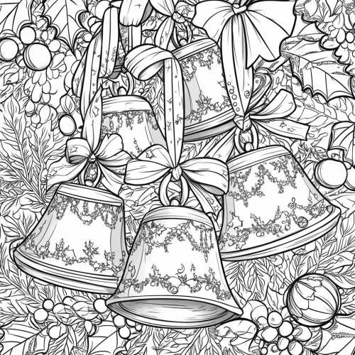 A simple coloring book of bells with a handle and a ribbon. next to the bells are 4 bunches of holly leaves. Clear and thin outlines, no shading, uncomplicated shapes, suitable for beginners, easy to fill areas, black and white line art, Christmas theme.