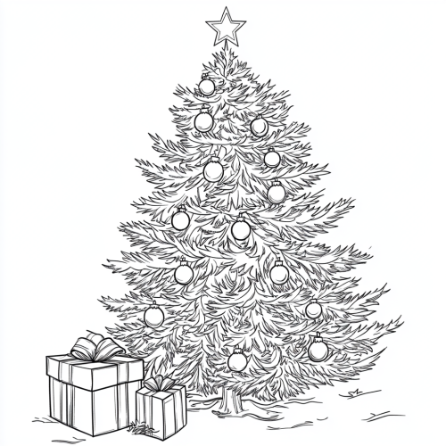 Christmas tree with plain baubles, star on the tip, 3 presents next to the tree, simple line art, coloring page for adults and teenagers, white background, black contour outline, low details, clear crisp lines, minimalistic style, christmas theme, no shading