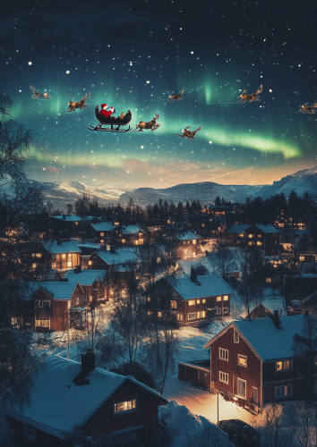 A wintery nighttime Christmas scene over a neighborhood in Norway. Santa and his sleigh and reindeer are visible in the sky, set on a backdrop of the northern lights. --ar 5:7