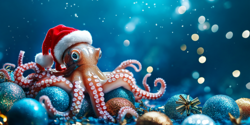 Festive Christmas-themed background for a sushi restaurant flyer, featuring sushi dishes like nigiri, sashimi, and maki rolls arranged artistically. Subtle holiday decorations with red and green accents, snowflakes, holly, and twinkling lights. Cozy and warm atmosphere, with wooden textures, chopsticks, and soft glowing lights for a festive Japanese aesthetic. No text. --ar 16:9 --v 6.0 --s 750