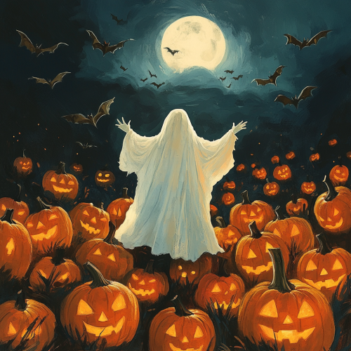 halloween atmosphere The foreground and surroundings are filled with orange jack-o'-lanterns of all sizes. A big sheet ghost in the middle raised his hands The background is dark There is moonlight and bats