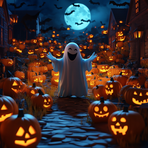 2D, halloween atmosphere The foreground and surroundings are filled with orange jack-o'-lanterns of all sizes. A big sheet ghost in the middle raised his hands and occupies 1/2 of the screen, The background is dark There is moonlight and bats and occupies 1/6 of the screen
