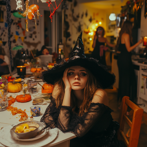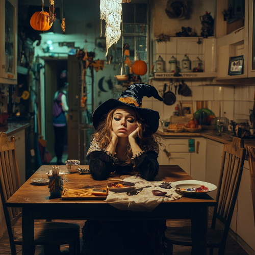 A realistic photograph of a woman in a simple funny witch halloween costume with simple make up tired out on sitting in a chair at a kitchen table inside a house, surrounded by a lively Halloween celebration with a few people dancing around her. Colorful decorations, people in various costumes and dim lighting create a festive atmosphere in the middle of the night. The woman looks exhausted, with remnants of a fun night around him --style raw