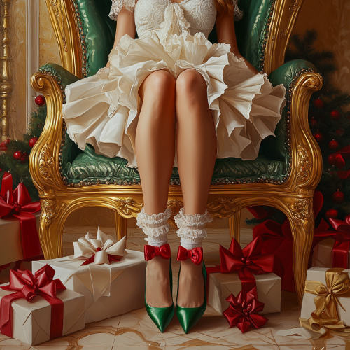 photorealistic image of a woman's legs sitting with red and white stockings on and a white frilly christmas dress, shot from the wasit down, she is seated in a gold santa chair and there are a bunch of presents that have been unwrapped all around her feet. Wrapping paper and bows are all around. She is wearing green high heels.