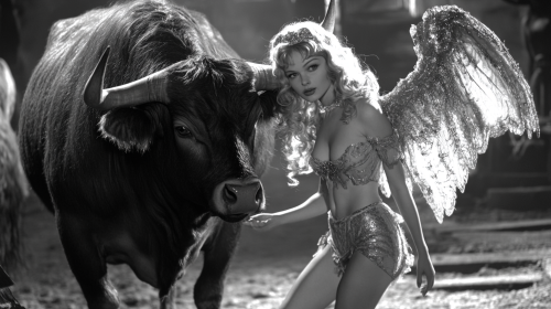 Stanley Kubrick, Eyes Wide Shut, occult mysticism beautiful cyber angel girl with blonde hair and wings. She is talking to a bull. Legs and skin showing --ar 16:9 --style raw --v 6.1