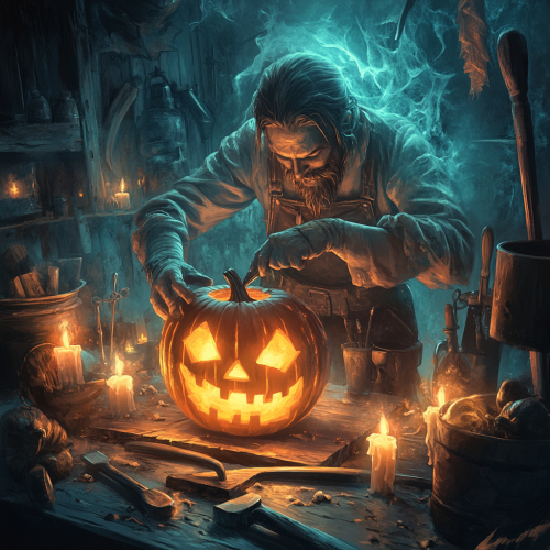 A spooky carpenter in a dimly lit workshop, carving intricate Halloween decorations from wood. Cobwebs hang from the rafters, and jack-o'-lanterns flicker in the corners, casting eerie shadows