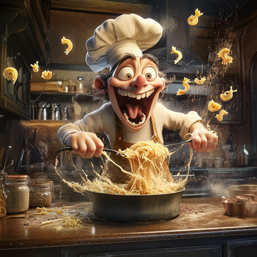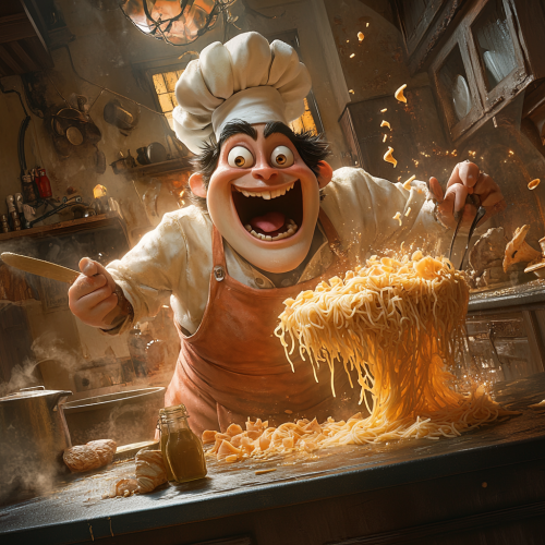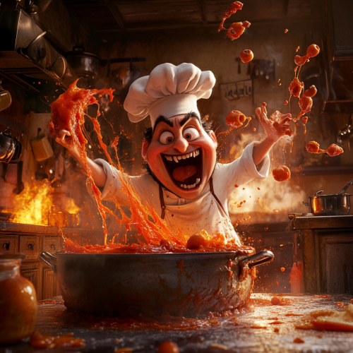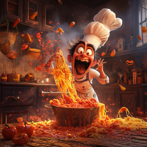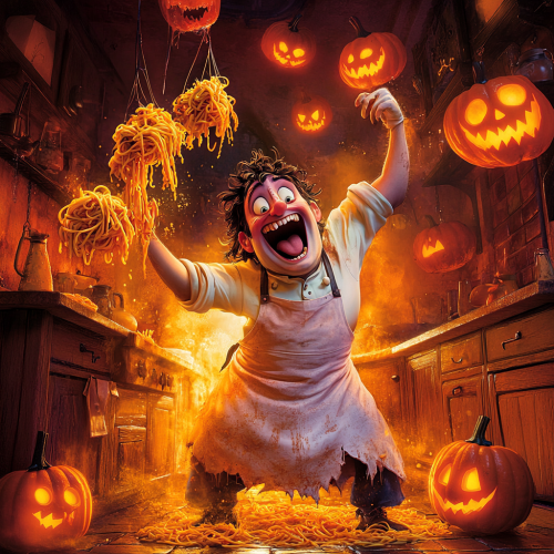 A wild-eyed Italian chef in a haunted kitchen, wearing a tattered apron and laughing maniacally as he cooks pasta that is tossing everywhere. Jack-o'-lanterns glow ominously around him, and spooky ingredients fly through the air - hotel transylvania style - disney movie poster