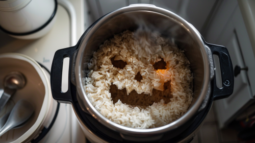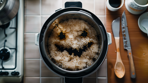 A top-down view of a clean, well-maintained rice cooker. Inside, the last remnants of rice are burnt, forming the eerie shape of a grinning demon's face, with sharp, angular features, hollow eyes, and an ominous, twisted smile. The rice cooker is set in a spotless, modern kitchen with sleek countertops, minimalist design, and neatly arranged utensils. The scene is lit with soft, dim nighttime lighting, casting subtle shadows that heighten the unsettling contrast between the pristine kitchen and the haunting, smiling demon face in the burnt rice. --ar 16:9 --v 6.0