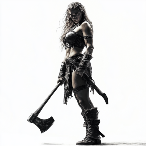 barbarian woman, stand before white bakckground, wearing black leatherboots, sideview, waiting for attack, holding axe in her left hand, looking angrily towards viewer