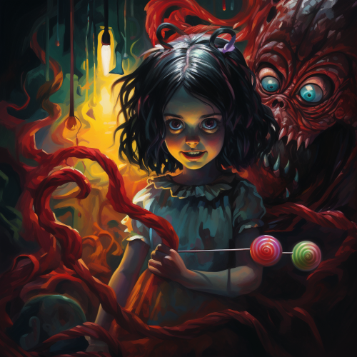 a creepy little girl holding a lollipop with curly black hair in a dark bedroom. a red monster is sitting next to her. The girl is holding a large lollipop with bright colors in a swirl pattern. The monster reaches for the lollipop with a creepy smile on its face in the style of a Stanley Kubrick film --v 5.2