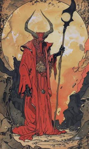 llustration, ink on paper, of a fantasy occult trading card of a red humanoid demon with two long horns, wearing cultist robes holding a sorcerer staff. with a backdrop of a hellish volcano in the art style of Graham Ingels, Mike Mignola, centered, psychedelic colors, vintage, --ar 3:5 --v 6.0 --s 75