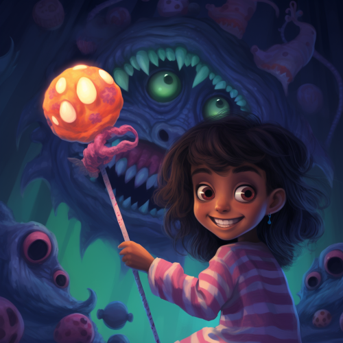 a little girl holding a lollipop with curly black hair in a dark bedroom at night sitting cross legged on the bed with a monster sitting next to her. The girl is laughing and holding a large lollipop with bright colors in a swirl pattern. The monster reaches for the lollipop with a creepy smile on its face. The only light in the room is from the door that is ajar. The hallway light is on and a small amount of light is shining into the kid's room --v 5.2