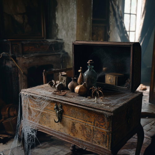 an old antique looking table, sat upon the table is a creepy looking chest, inside the chest are a bunch of haunted items, the table is inside an old looking room, spider webs cling to the chest, the chest is open