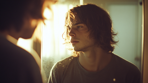 16mm analogue still, the same framing as la hane mirror scene, sunlight softly coming in, A man stares back at their reflection in the mirror. They’re covered in sweat and slightly out of breath with long, shaggy hair. They’re a little bit out of shape. They look directly to camera facing the front, standing in centre frame --ar 16:9