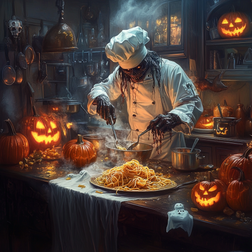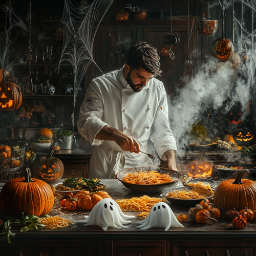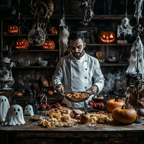 An Italian chef in a spooky kitchen, preparing traditional Halloween dishes with a twist. The chef wears a classic white coat, surrounded by pumpkins, ghost-shaped pasta, and eerie decorations