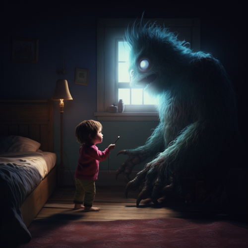a toddler in a dark bedroom sitting on its bed with a monster hand reaching from under the bed. The toddler is crying as the monster takes the lollipop from the kids's hand with a creepy smile on its face. The only light in the room is from the door that is ajar. The hallway light is on and a small amount of light is shining into the kid's room --v 5.2