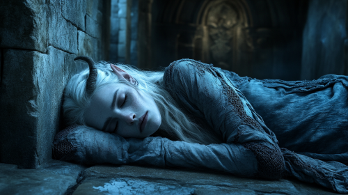 pale elven woman, scary, asleep, empty eyes, sleeping on floor, paper white skin, deathly pallor, tiefling horns twisted on head, in dark gloomy medieval castle, dnd npc, style of video game concept art, --ar 16:9
