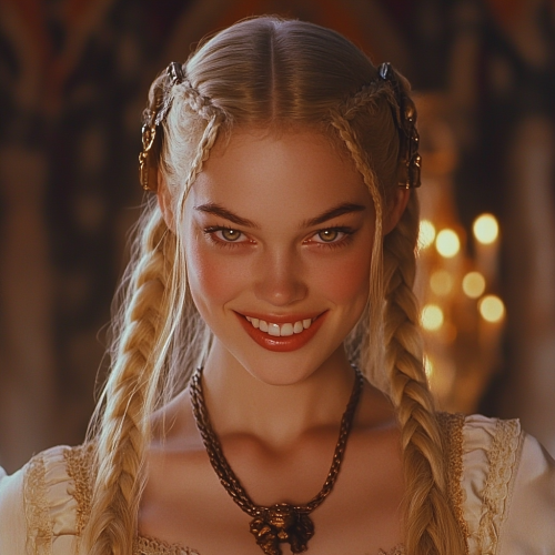 Stanley Kubrick, Eyes Wide Shut, occult mysiticsm beautiful cyber angel girl with blonde braided hair. She is smiling alluringly. She is very attractive. --ar 1:1 --style raw --v 6.1
