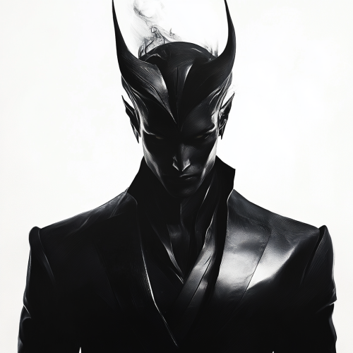 close up portrait of A dark figure in a sleek black suit with subtle horns and a shadowy crown, standing against a solid white background. The face is serious with sharp features, symbolizing power and corruption. The figure’s presence is both commanding and ominous. --v 6.1