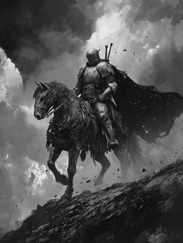 dark horror fantasy illustration for dungeons and dragons, depicting a devilish knight wearing a deteriorated full plate holy armor. He is on a devilish horse, both located in hell landscape --ar 3:4 --v 6.1
