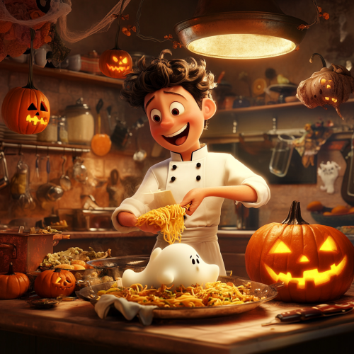 An Italian chef in a spooky kitchen, preparing italian dishes. The chef wears a classic white coat, surrounded by pumpkins, ghost-shaped pasta, and eerie decorations - halloween - disney pixar italian spooky movie poster