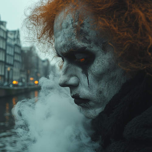 hyper realistic photograph of the state of amsterdam as a horror character based on state history with huge joint and smoke --chaos 10 --style raw --stylize 500 --v 6.1