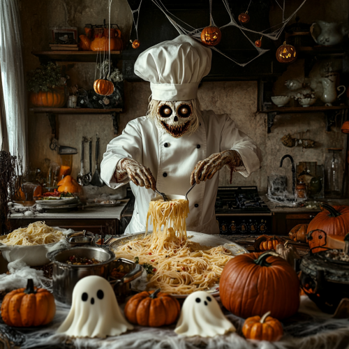 An Italian chef in a spooky kitchen, preparing italian dishes. The chef wears a classic white coat, surrounded by pumpkins, ghost-shaped pasta, and eerie decorations - halloween - creepy horror movie