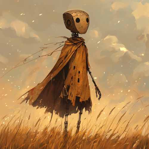 Futuristic scarecrow in the year 3000, drawn in a Ghibli-inspired style, standing in a surreal field of glowing wheat. The scarecrow is made from salvaged materials, with a simple and skeletal design using rusted metal and torn cloth. Its head resembles a whimsical mask with hollow eyes, giving it a mysterious expression. The tattered clothing flows gently as if caught in a light breeze. The setting has a dreamy, otherworldly atmosphere, with soft, swirling clouds in the background. The art style is minimalist, focusing on shape and form rather than intricate details.