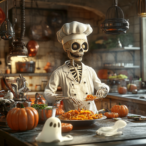 An Italian creepy chef is a skeleton in a kitchen, preparing italian dishes. The chef wears a classic white coat, surrounded by pumpkins, ghost-shaped pasta, and eerie decorations - halloween movie