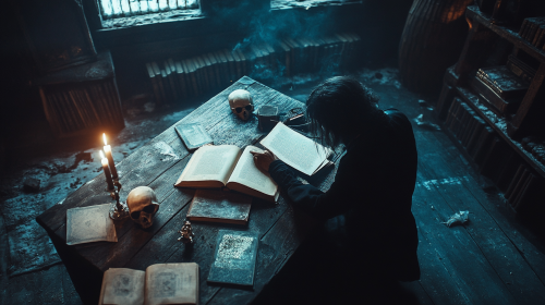 Dark,gloomy,medieval,Gothic interior..The abode of the magician-warlock.A long table covered with a tablecloth to the floor.There are open books,a candlestick,and a skull on the table.The magician is sitting near the table,reading a book lying on the table.A bluish glow emanates from the pages of the book,reflecting on the magician's face... --ar 16:9 --v 6.1 --style raw