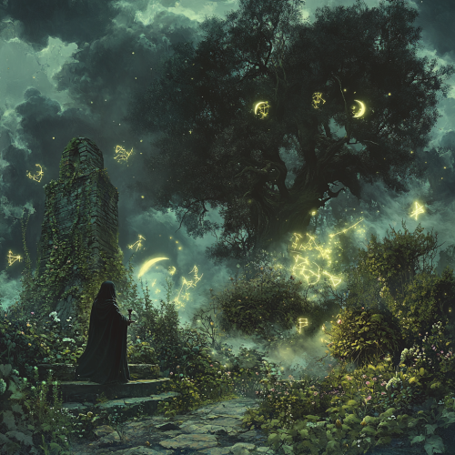A dark, mystical scene featuring a collection of poisonous plants associated with Saturn: belladonna, mandrake, wolfsbane, and hemlock. The plants are arranged around an ancient stone altar under a gloomy, cloudy sky with hints of eerie moonlight filtering through. A towering yew tree stands in the background, its branches twisting ominously. The atmosphere is heavy with shadow and death, evoking the energy of the Underworld. In the foreground, a witch cloaked in black is holding a mandrake root, with glowing Saturnian sigils floating in the air around her. The colors are muted--deep greens, blacks, and purples--giving the scene an ancient, haunting feel