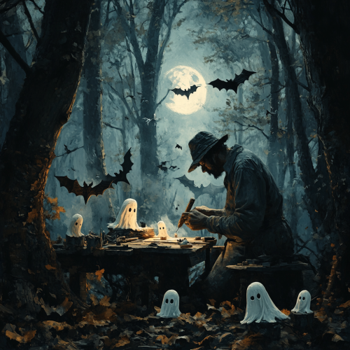 An enchanted scene of a woodworker in a haunted forest, skillfully crafting spooky wooden figures of ghosts and bats. The air is filled with mist, and the full moon shines through the trees