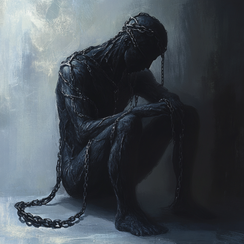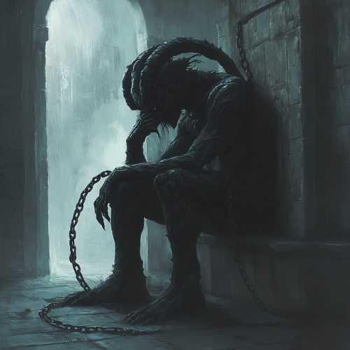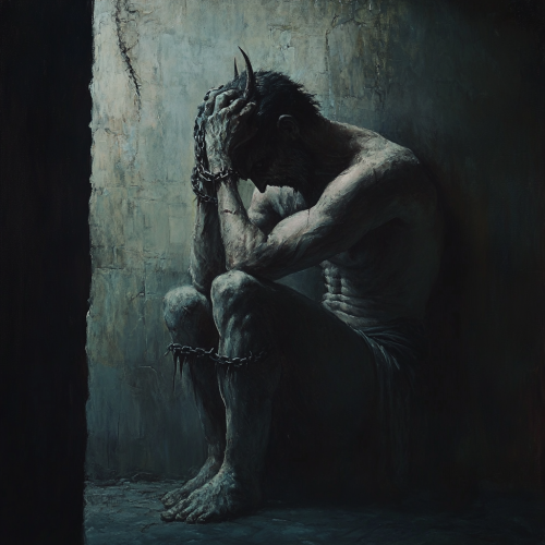 A demon sitting in a dark room in a castle while holding his head, chains coming out of his head and ribs, demonic, horror, dark, evil, night time, painting