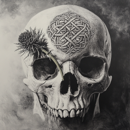 realistic human skull with Celtic symbols carved into it, Scottish thistle growing out of one eye hole, day of the dead markings on the skull, black and grey scale, realism
