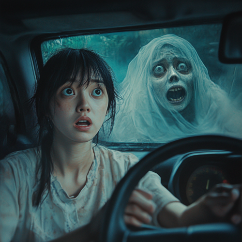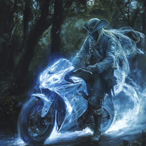 In a haunting scene, a ghostly creature looms over an American revolutionary soldier, its translucent form shimmering in shades of pale blue and white. The soldier, clad in a tattered blue coat and tricorn hat, looks startled as the spectral figure yanks him off a sleek white Yamaha R1 motorcycle. The bike's polished surface glints under a ghostly moonlight, contrasting with the eerie mist swirling around them. The soldier's expression reflects a mix of confusion and fear, while the creature's hollow eyes seem to draw energy from the night, creating an unsettling atmosphere. The backdrop is a shadowy forest, adding to the surreal tension of the encounter.