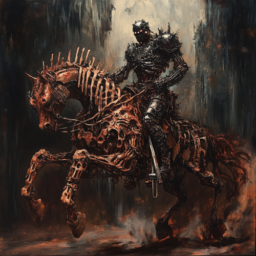 Oil painted surreal demonic war horse rider, riding a demonic horse. He is a monster humanoid creature. The armor is made of metal parts and bones, fantasy setting, horror, dark, gross, evil