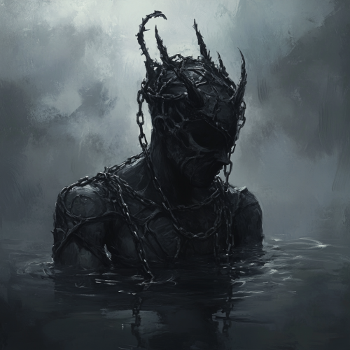Oil Painted, concept art of a black surreal humanoid insect demon in a pool of dark water, chains coming out of his head and ribs, demonic, horror, dark, evil, gothic, misty, occult