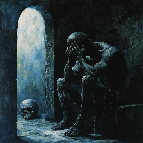 A demon sitting in a dark room in a castle staring at a skull while holding his head, chains coming out of his head and ribs, demonic, horror, dark, evil, night time, painting