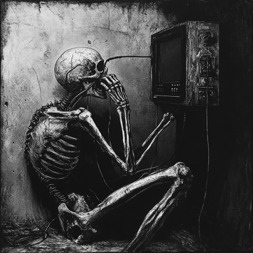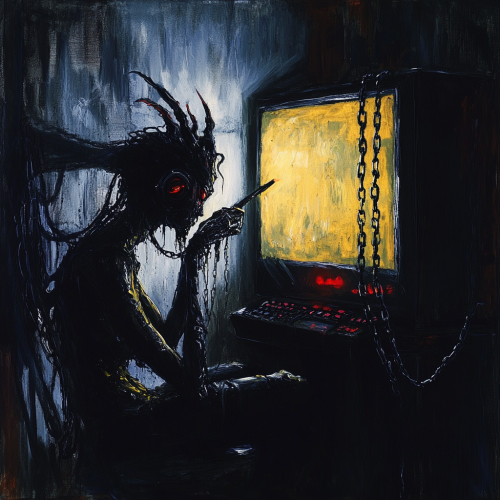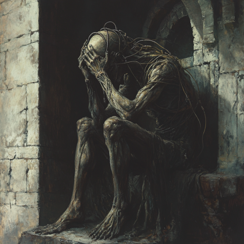 A demon sitting in a dark room in a castle, staring at a while holding his head, wires coming out of his skull and ribs, demonic, horror, dark, evil, medieval, painting