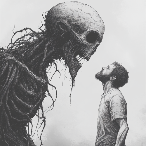 Create a horrifying depiction of anxiety as a large looming creature, almost bug like resembling a Grim Reaper, looking down and torturing an individual by pulling his hair and skin from the back of his head. This creature could almost be squatting on the man’s shoulders. The angle should be from below looking up. This should be done in the style of line art, and look like a tarot card --s 750